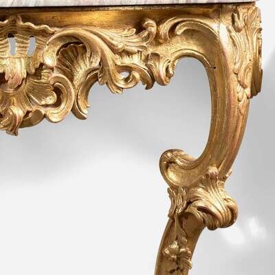 The giltwood bases of Rococo form, with c-scrolls and foliate devices.