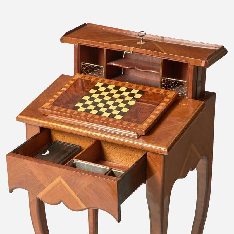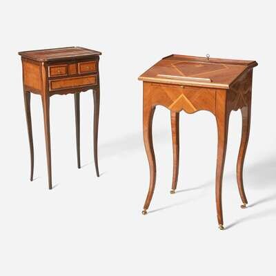 Together with a Louis XVI style marquetry and parquetry table en chiffonnière.