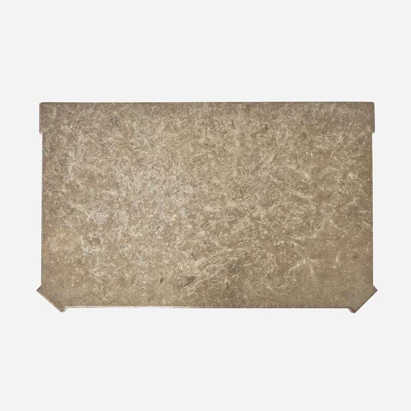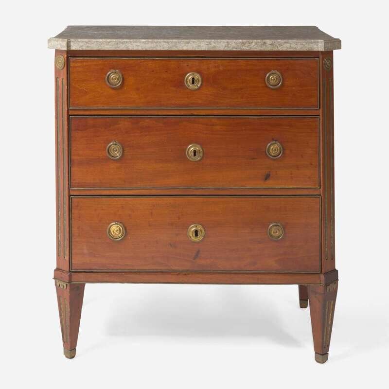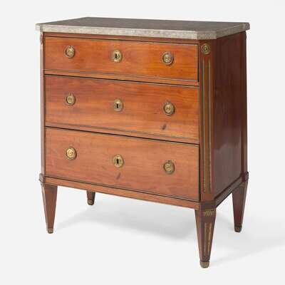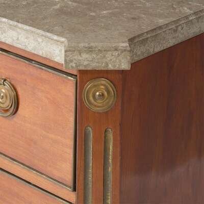 A French Directoire brass inlaid walnut commode with Derbyshire fossil top circa 1800