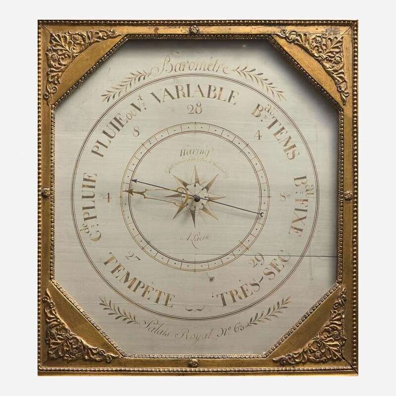 Painted backboard, inscribed, "Baromètre/ Palais Royal No. 63/ Haring/ Opticien de S.M. le Roi & Würtemberg/ A Parie," the giltwood frame surrounding glass front, surmounted by cornocopias and laurel branches flanking an urn issuing a sheath of wheat.
