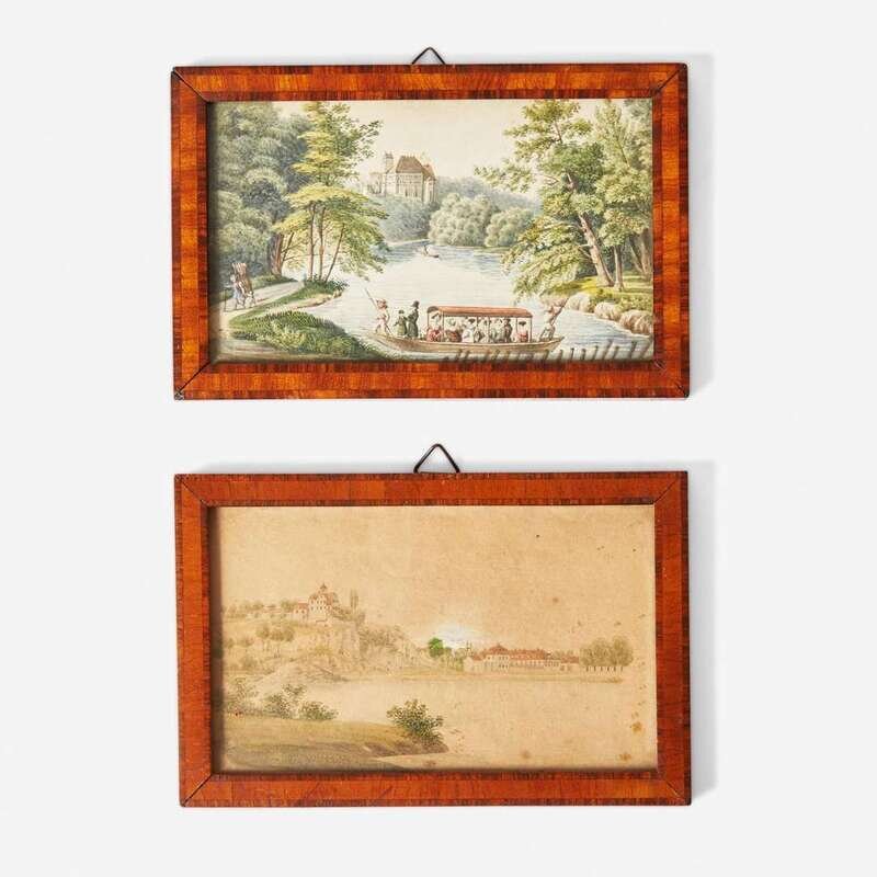 German School 19th century Two Miniature Works: Riverfront Views, one with Boating Scene, dated "1834"