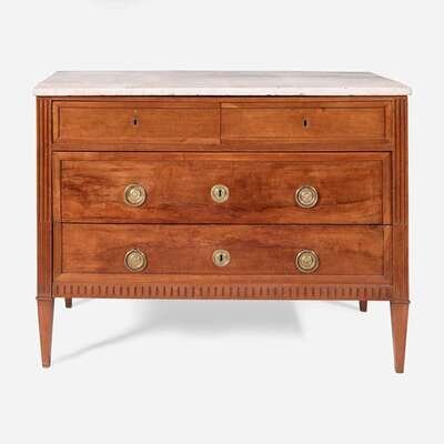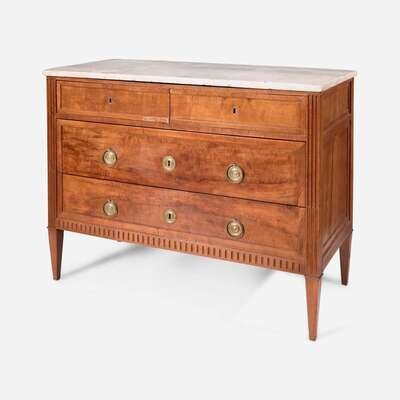 A French Directoire carved fruitwood commode with white marble top circa 1800