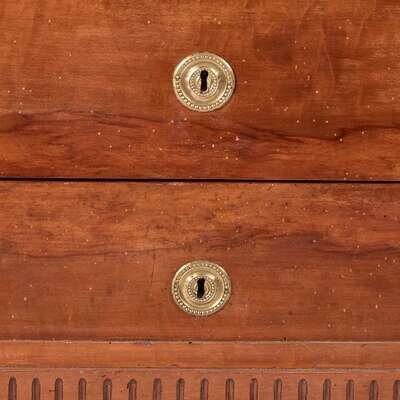 Plain rectangular marble top, over flat front and paneled sides, two paneled short drawers over two long paneled drawers, stop-fluted corners, fluted molding along base, square tapered legs, with brass ring pulls.