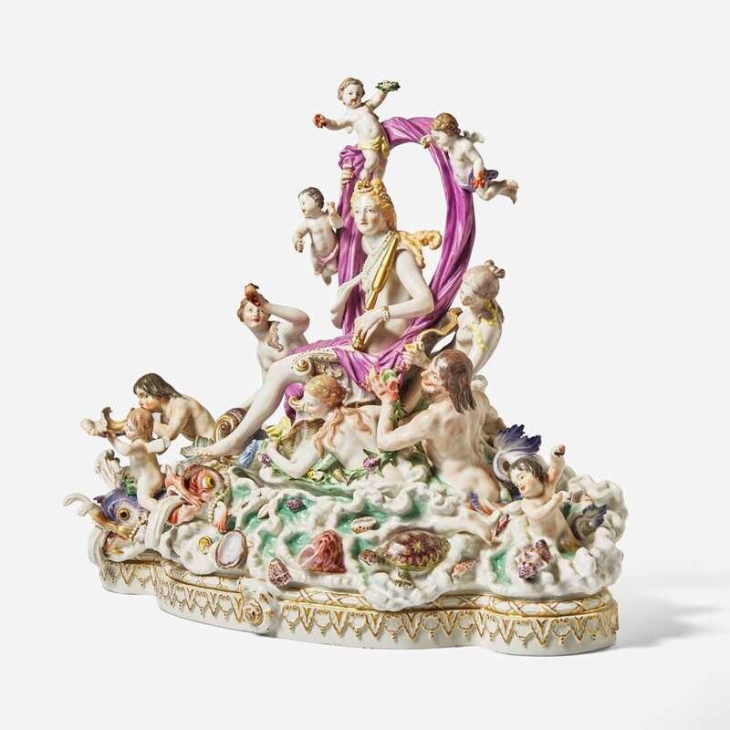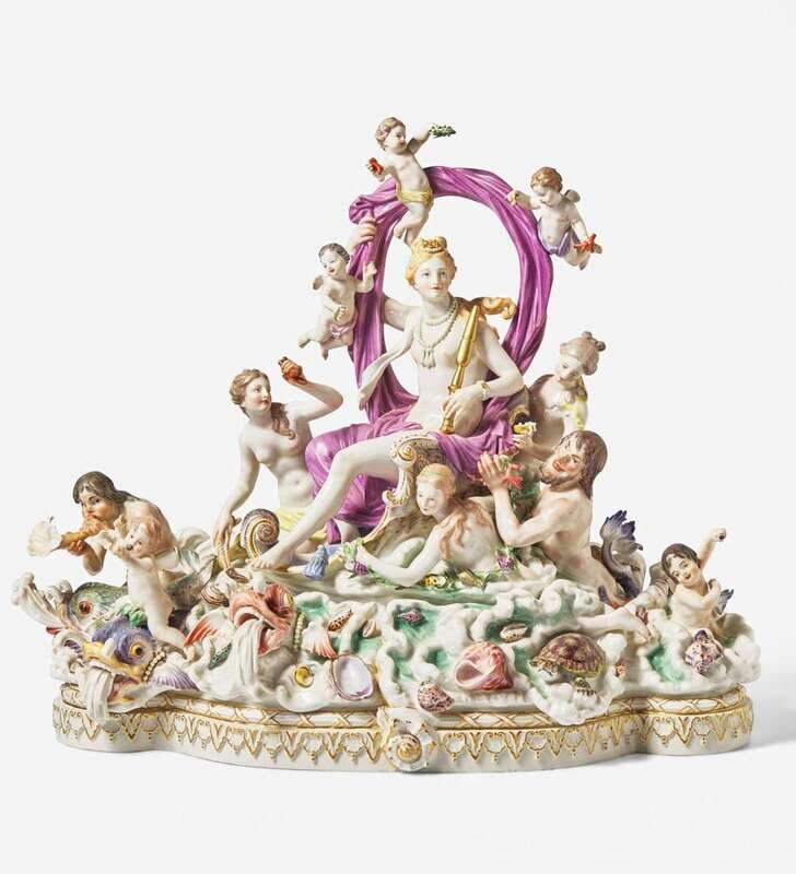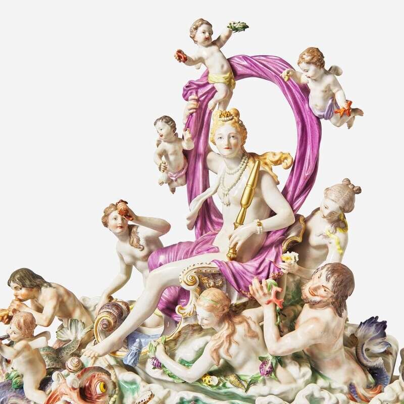 After the 1772-1774 model by Johann Joachim Kändler (German, 1706-1775), depicting Amphitrite, goddess of the sea, and surrounded by naiads, sea creatures, and putti, on a shaped base modeled with shells and nautical reliefs, composed of four parts, the two bottom sections adhered and screwed, the two upper sections detach, all parts bearing crossed swords mark in blue underglaze and inscribed mark, "No. 2," some also with impressed numeral, "144."