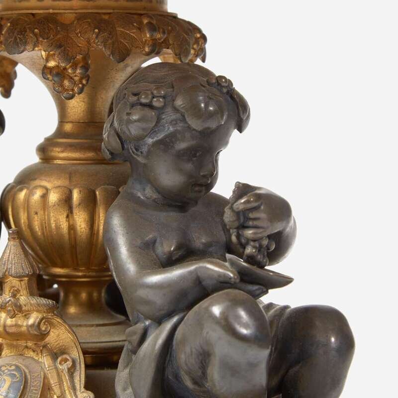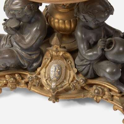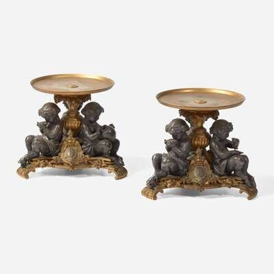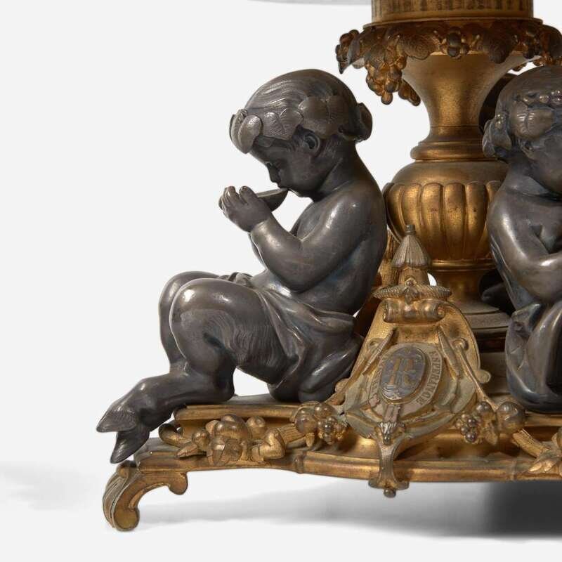 The bases each with three fauns and shield-form cartouches bearing monogram "R" flanked by the words "Travail" and "Esperance."
