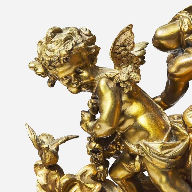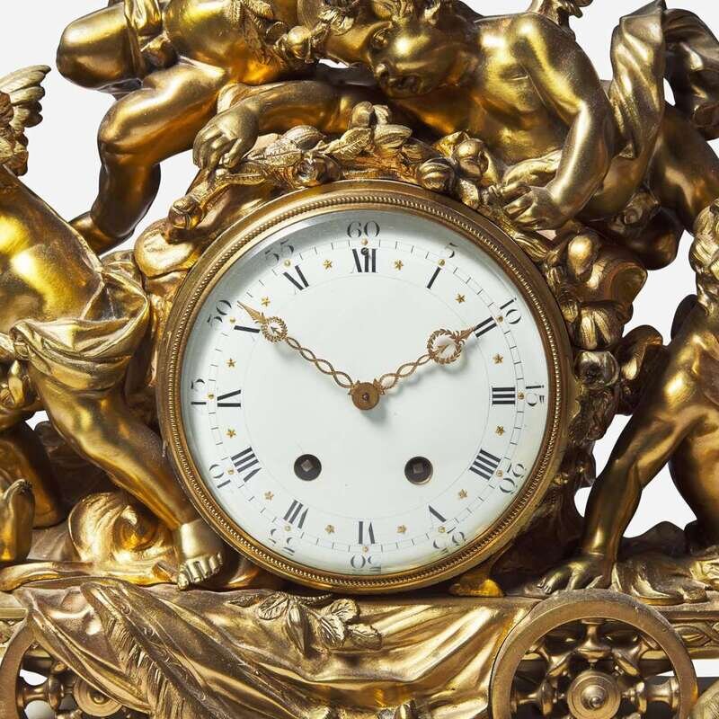 With round enamel dial, gilt bronze surround in the form of putti atop celestial cart, on marble plinth, bun feet, the back of works marked "A.1," "H&H," "Made in France," and "1384/ 69."