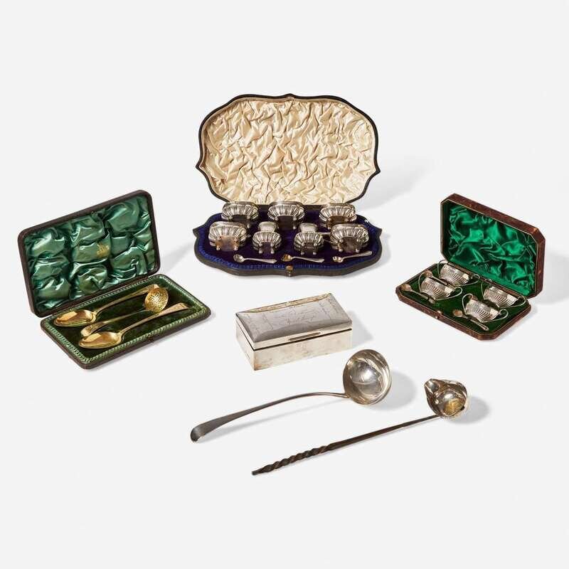Comprising a sterling silver toddy ladle with impressed silver crown, dated "1708," and baleen handle, by William Sumner II, London, 1792; a sterling silver ladle by George Smith V, London, 1798; a cased set of gold-washed sterling silver tablewares with bright-cut decoration, including a pair of tablespoons by George Wintle, London, 1794, and a reticulated ladle by Richard Crossley, London, 1783, the case marked Elkington & Co.; a cased set of four sterling silver salts and salt spoons by James Dixon & Sons, Sheffield, 1898; a cased sterling silver condiment set including four salt cellars with cobalt blue glass liners, four salt spoons, a mustard pot with cobalt blue glass liner, mustard spoon, and a pair of pepper shakers, by maker "TL," London, 1899 and 1900; and a sterling silver box with inscribed signatures on top, lined with cedar, by W.H. Haseler, Ltd., Birmingham, 1932; all items marked.