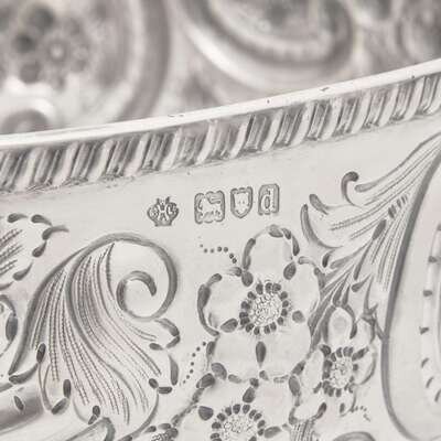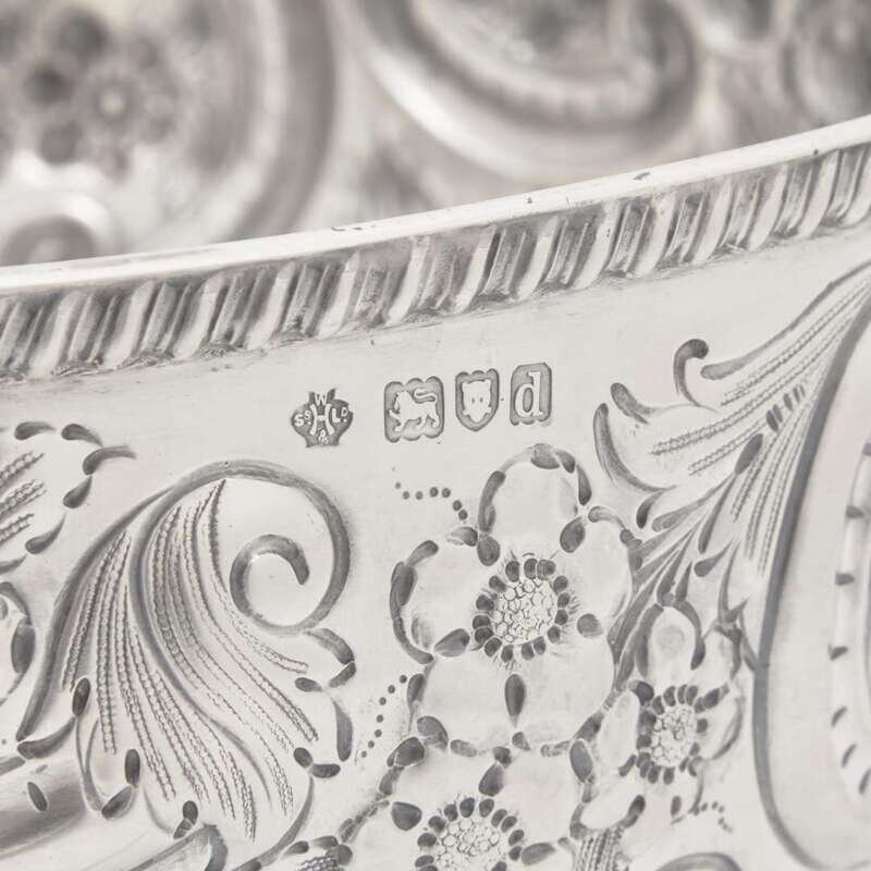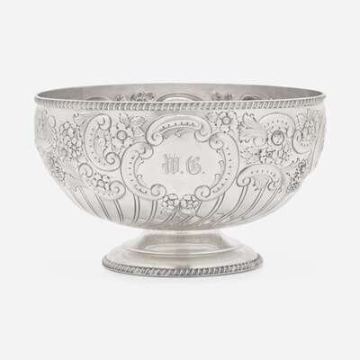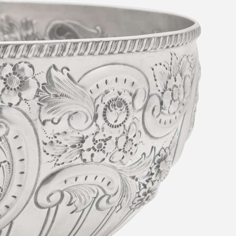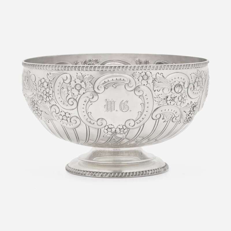 With gadrooned rim and footed base, the body decorated with repoussé floral motifs and c-scrolls flanking two reserves, one reserve engraved with monogram, "W.G.," marked.