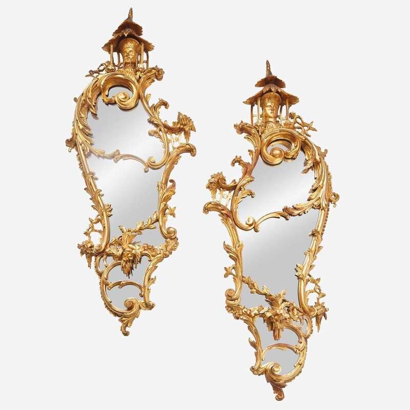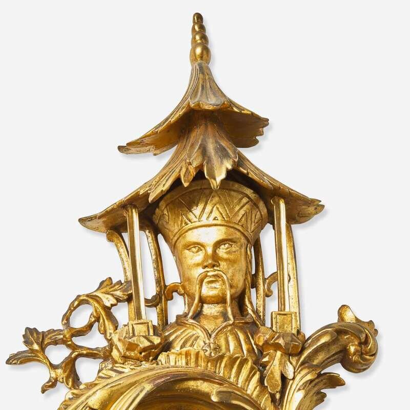 Of Rococo form, with c-scrolls, rockwork, and foliate motifs, surmounted by pagoda-form tops framing busts of Chinese figures.