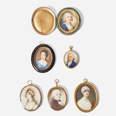 Comprising three portrait miniatures of ladies, two with gilt locket cases, one with aperture containing hairwork and surrounded by blue enamel verso, and one with ebonized and parcel gilt wood frame; and three portrait miniatures of gentlemen, two with gilt locket cases, one with blue enamel back, and one with gilt metal surround and nestled in original red leather case; all watercolor.