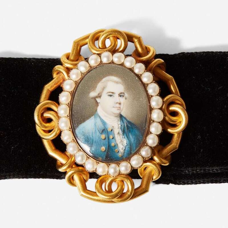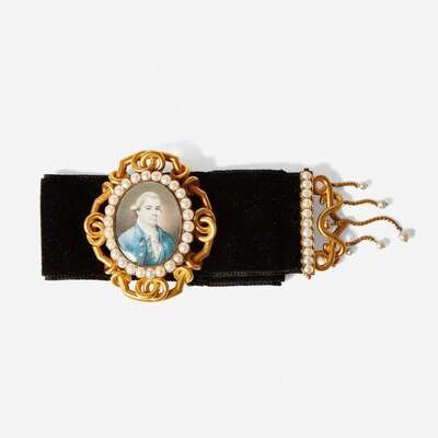 Signed, "J.J.," l.l., the obverse with aperture containing hairwork and gold cipher "AH," housed in Victorian era gilt and seed pearl case with velvet band; the miniature watercolor.