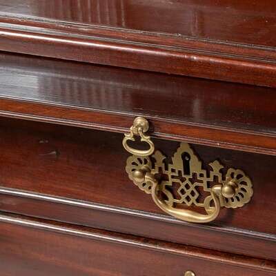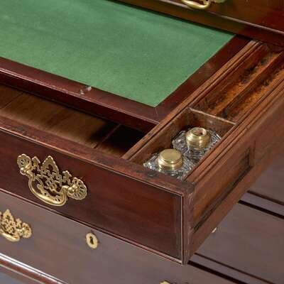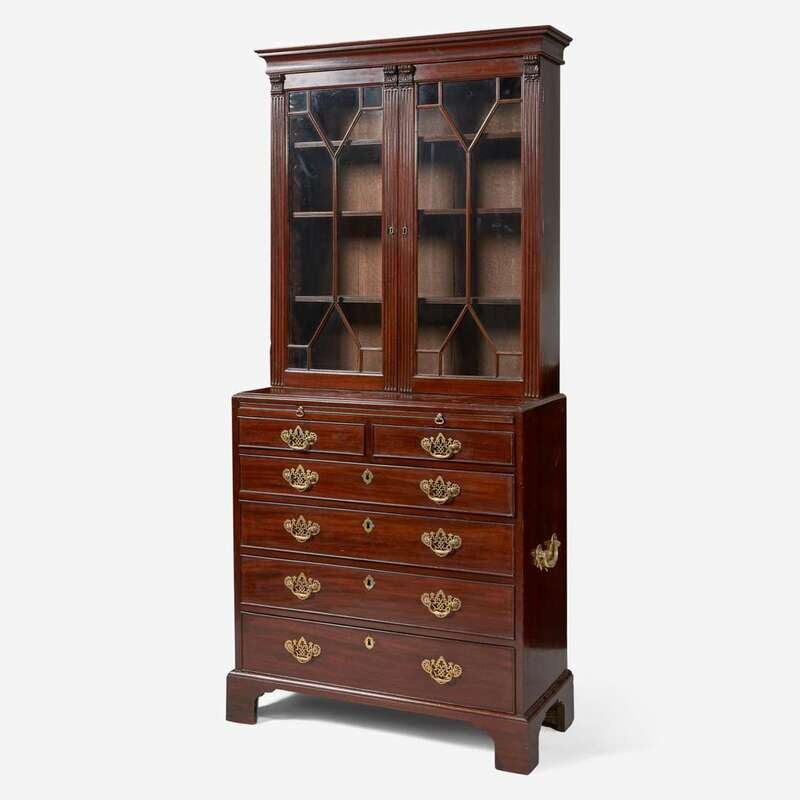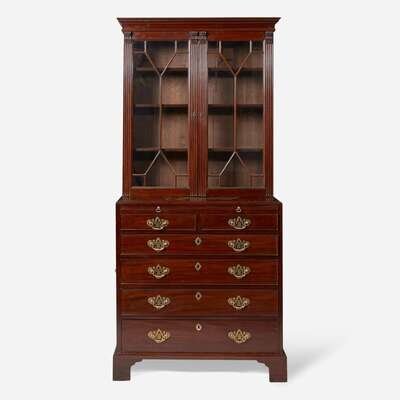 In two parts, the upper section with molded cornice over two glazed astragal doors, flanked by Classical pilasters, with three adjustable shelves, the lower section with dressing slide over two short drawers, over four graduated long drawers, the upper-most drawer revealing interior fitted with baize-lined writing surface and compartments for inkwells and writing instruments, molded base on bracket feet, the side panels with brass handles.