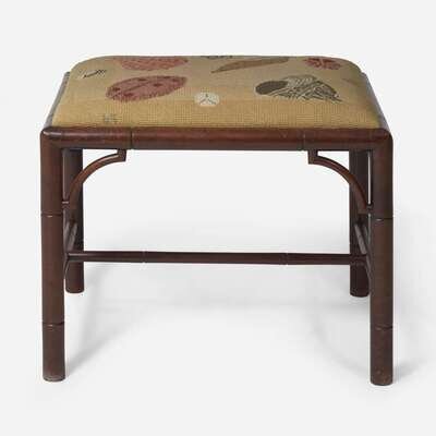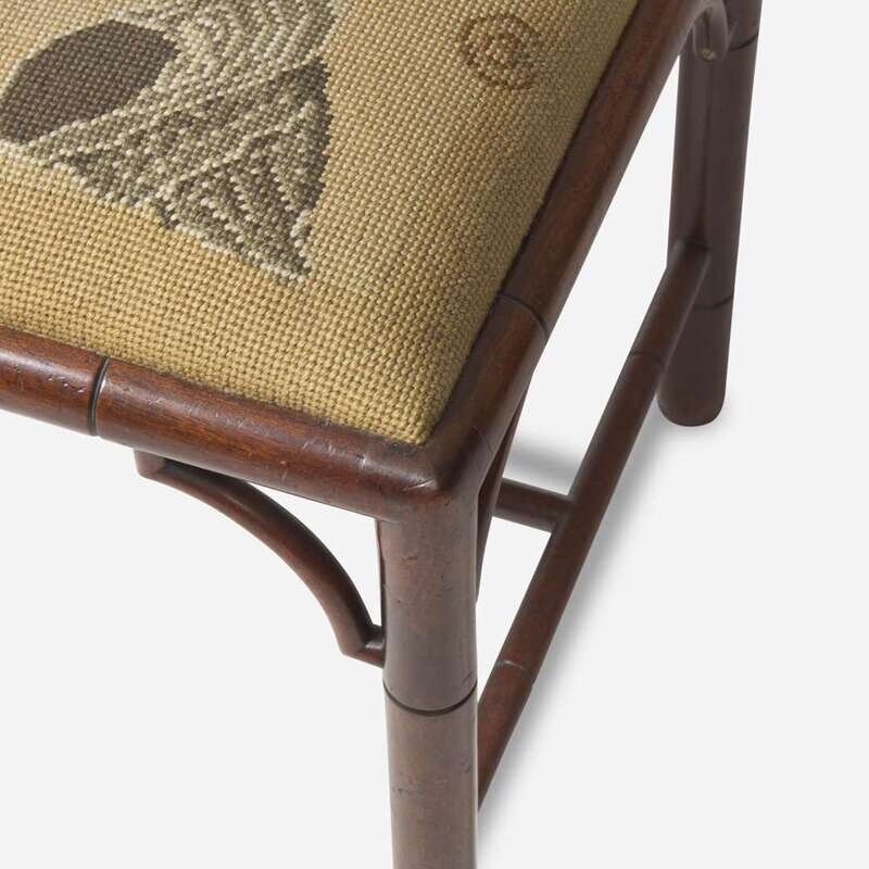 With faux bamboo carved legs and frame, upholstered slip seat.