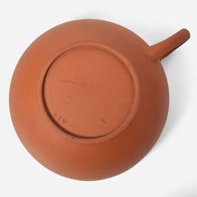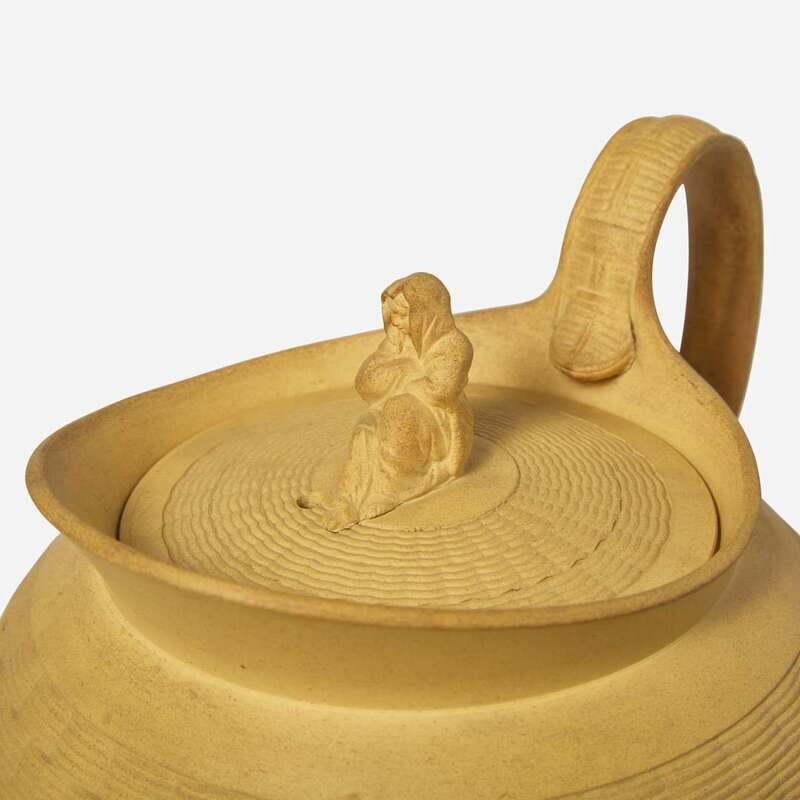 Comprising a caneware teapot with mourner finial, a caneware beehive sugar dish, a black basalt creamer, two caneware or prattware covered teabowls, a caneware or prattware creamer, and a rosso antico teacup and saucer.