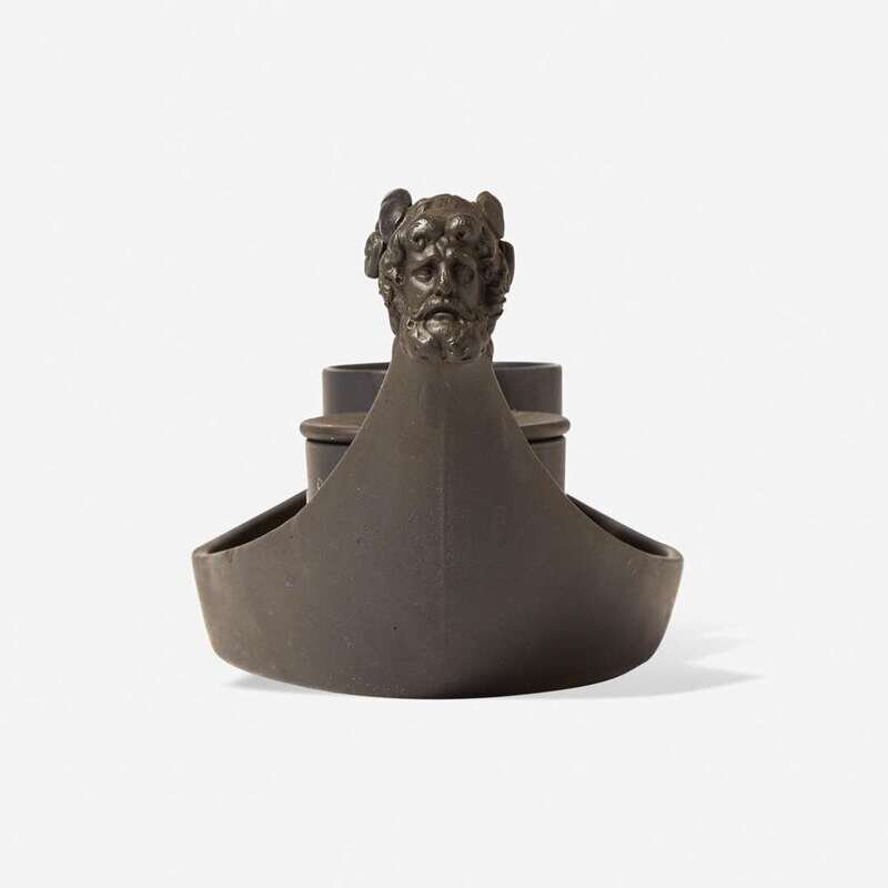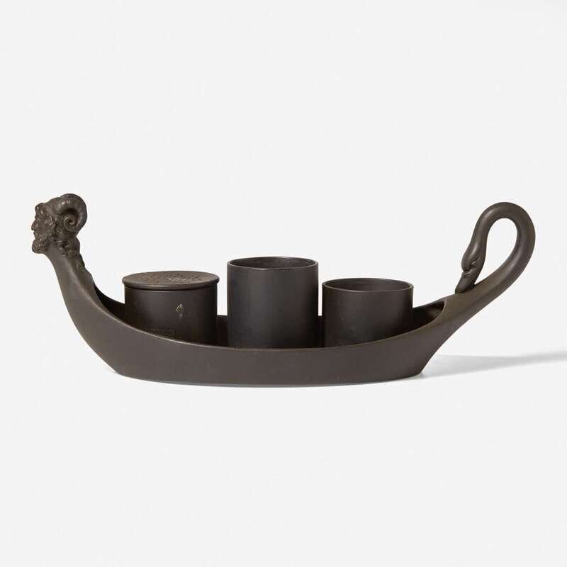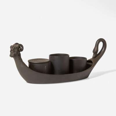 With three containers, one with removable shaker, the stern with swan terminal and the prow with satyr head; marked to underside, "Wedgwood."