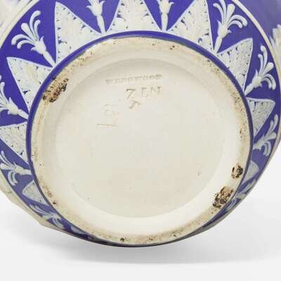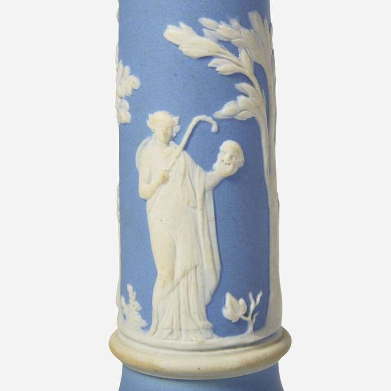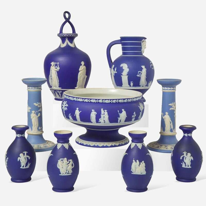 All decorated with typical Classical imagery; comprising a vase with intertwined handle, marked, "Wedwood," "NTZ," and inscribed mark "137"; a pair of bud vases, marked, "Wedgwood"; a pair of bud vases, marked, "WEDGWOOD/ Made in England"; a pitcher, marked, "Wedgwood," "Doric," and "DWT"; a pair of candlesticks, marked, "Wedgwood," "WUR," and "A"; and a footed bowl, marked, "Wedgwood," "Made in England," and "7."