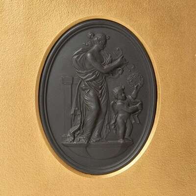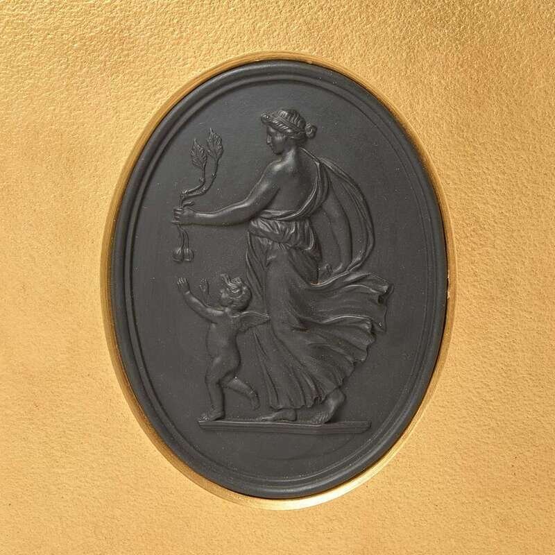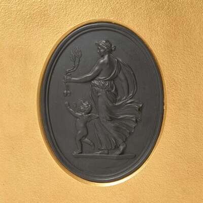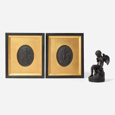 Comprising two oval plaques, depicting Venus and Cupid, both marked to back, "WEDGWOOD," and a small sculpure of Cupid, impressed to back, "CUPID," and marked, "WEDGWOOD."