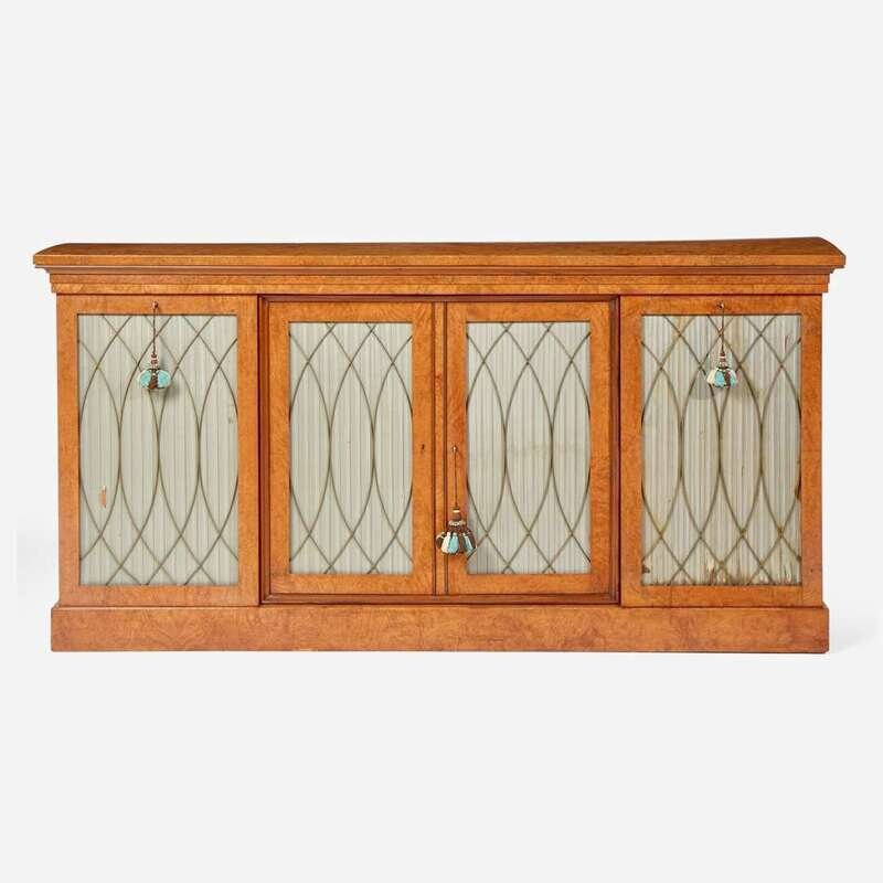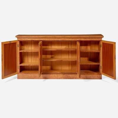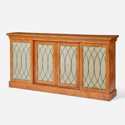Rectangular top, two center doors flanked by two side doors, each with brass grill and lined with silk, revealing adjustable shelves, molded base.