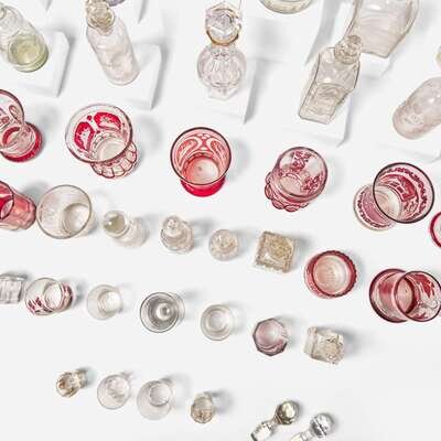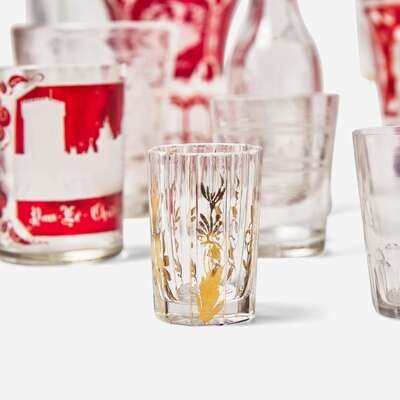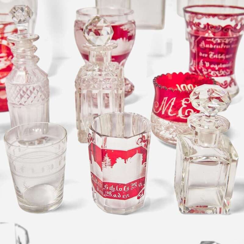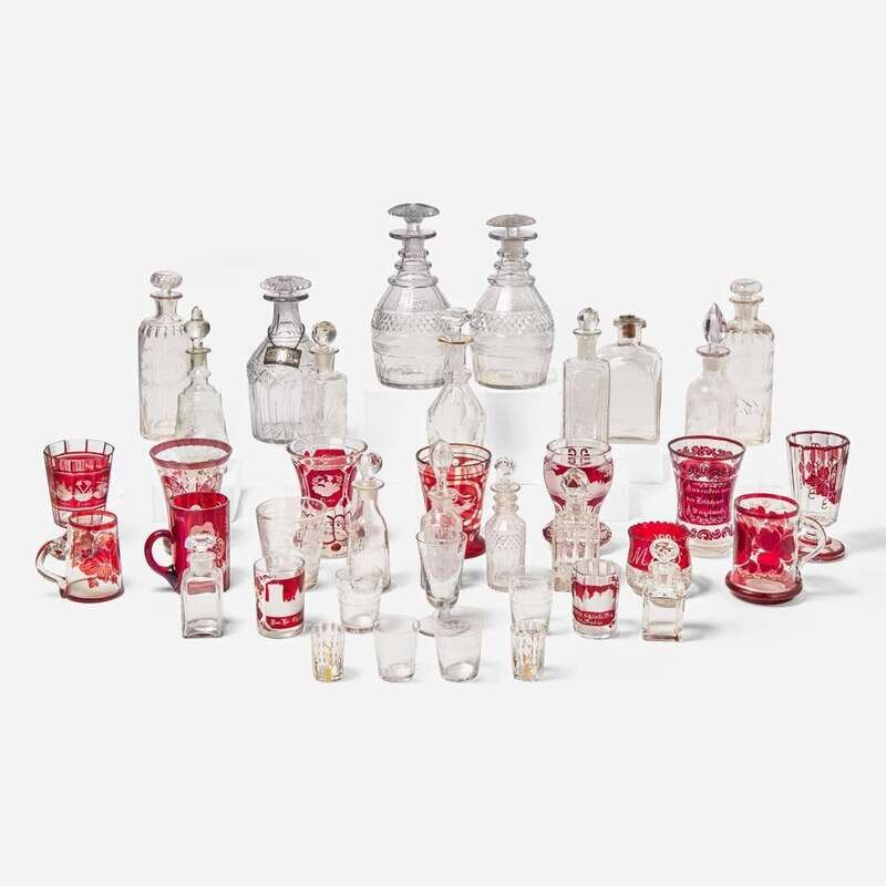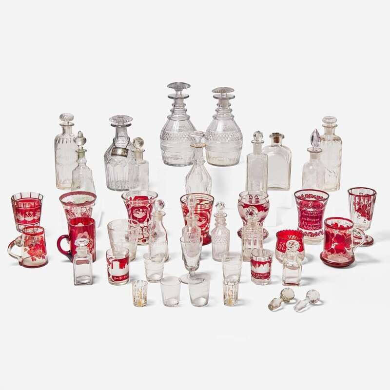 Comprising an early German etched flip cup depicting man harvesting grapes, dated "1709"; seventeen decanters / bottles of various forms, including a decanter inscribed and dated, "Reymersholms/ Gamla Aquavit 1869," two inscribed, "Cologne," one inscribed, "Seely's Orchid Perfume Calanthe," and one inscribed, "Bay Rum"; a cordial glass etched with bird and inscribed, "Merry Xmas/ W H Green/ 1st Lt 995 F A Bn/ France 1900"; six clear shot glasses; and thirteen German Bohemian etched red cups of various forms, most inscribed, late 19th / early 20th century.