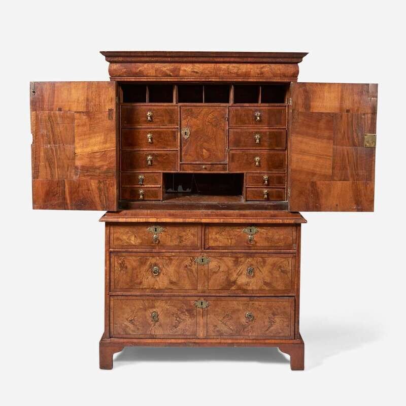 In two parts, the upper section with molded cornice, bolection drawer over two doors, revealing fitted interior with an assortment of drawers surrounding prospect door, the lower section with waist molding, over a series of two short drawers and two long drawers, molded base, on bracket feet.