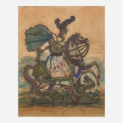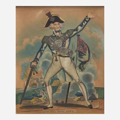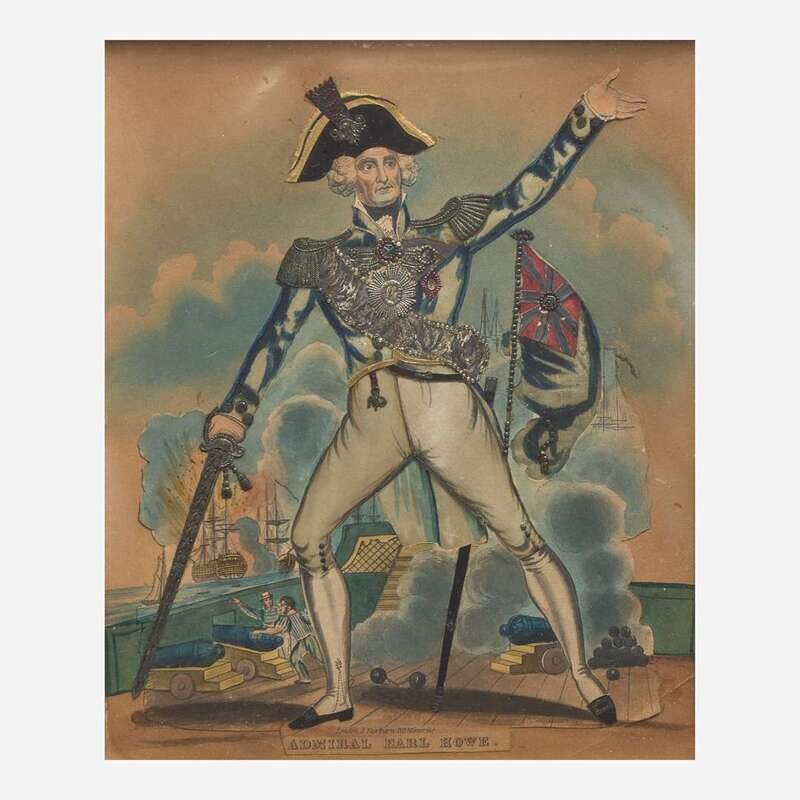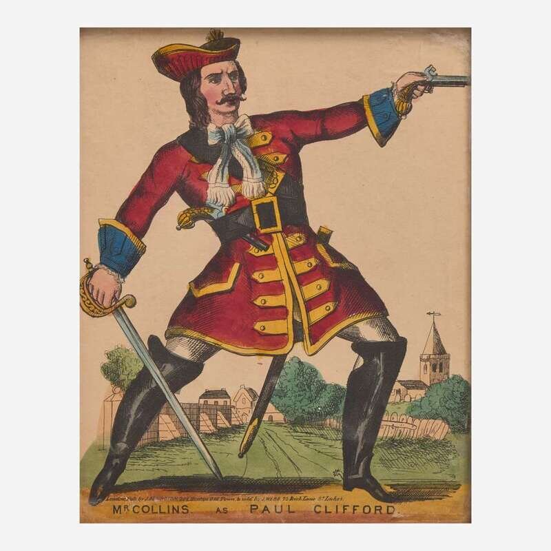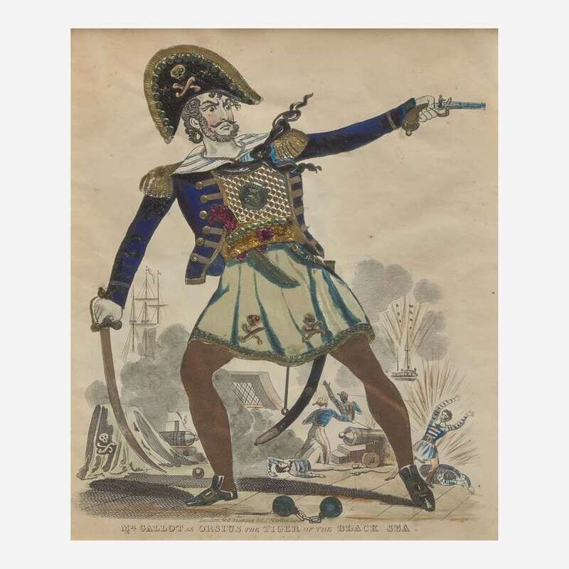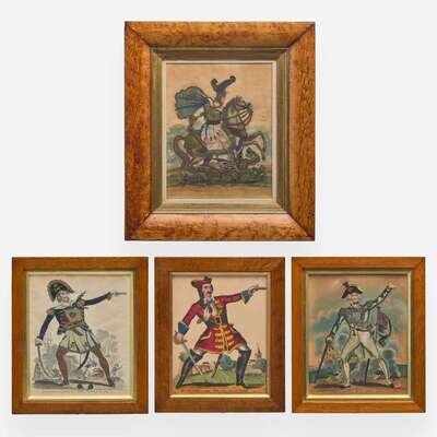 Comprising one each depicting "St. George and the Dragon," "Admiral Earl Howe," "Mr. Gallot as Orsius the Tiger of the Black Sea," and "Mr. Collins as Paul Clifford," some matted, all framed.