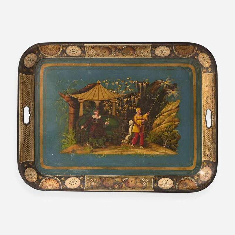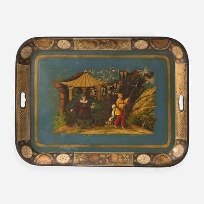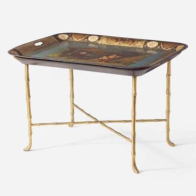 The tray decorated with two figures near a pavilion in a tropical landscape, one figure seated on a sofa and the other holding a parade staff, surrounded by border with latticework, rosettes, and fruit; the tray with later fitted brass faux bamboo table base.