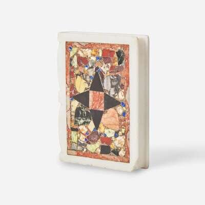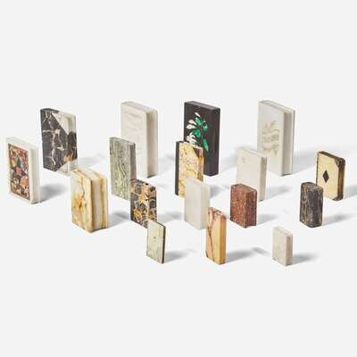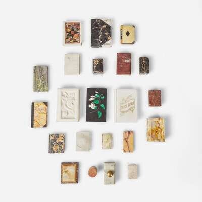 Overall utilizing varied types of marble and stones, including some pietra dura examples; comprising sixteen book-form paperweights, some with carved or incised details: one with carved rose, one with carved cross, one incised with banner reading "Don't Open," and one incised and dated, "AKPO?O?IS ATHNøN [Acropolis Athens] 1906," and some block or cylinder shaped paperweights, one with pietra dura Lily of the Valley motif incorporating malachite.