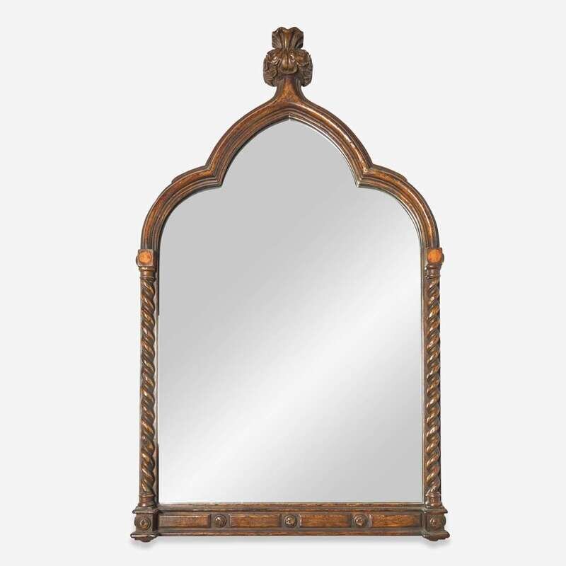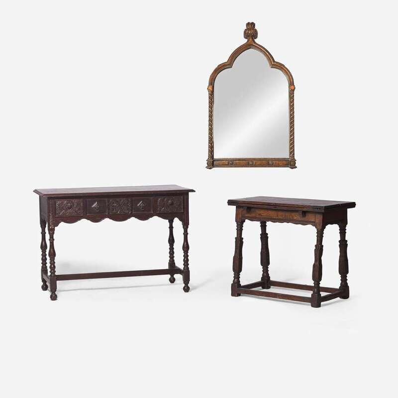 Comprising a Baroque Revival oak side table, having three drawers with carved fronts, on turned legs and stretchers, probably 20th century; a small Baroque Revival oak table with flip top, having inset leather writing or gaming surface, carved and turned legs on stretchers, late 19th / early 20th century; and a Gothic Revival painted wood mirror, 20th century.