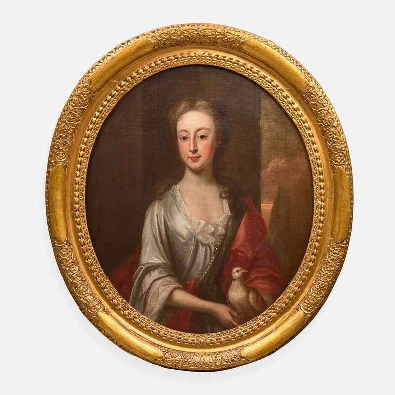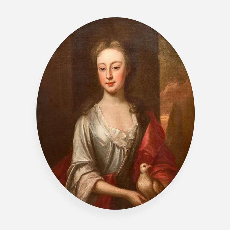 Manner of Sir Godfrey Kneller (British, 1646-1723) Portrait of a Young Girl in White with Red Shawl Holding a Dove, Bust-Length