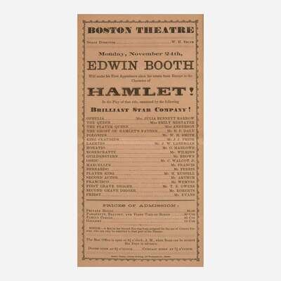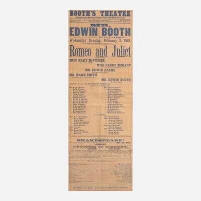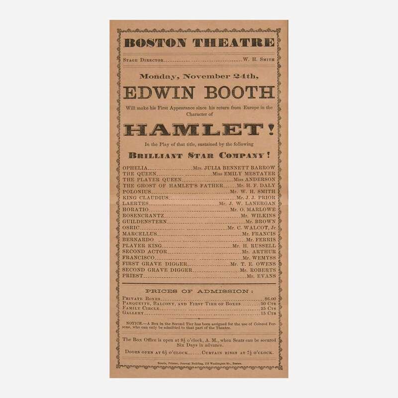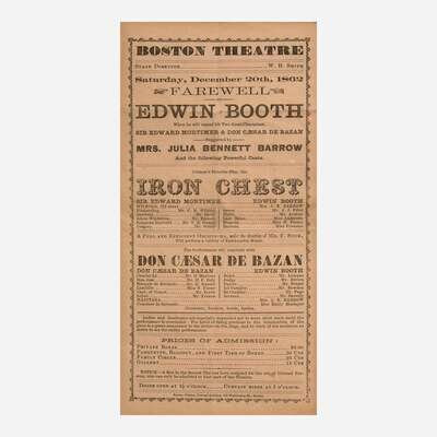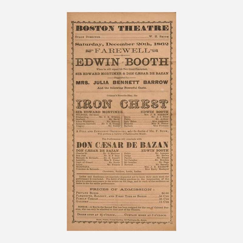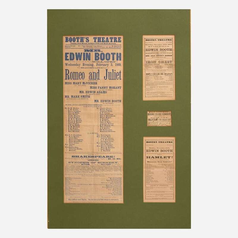 Boston and New York, ca. 1862-69. Group of three 19th-century playbills for performances by American actor Edwin Booth of the theatrical Booth family, and brother of presidential assassin John Wilkes Booth. Including: The Boston Theatre, Saturday, December 20, 1862, featuring Booth as Sir Edward Mortimer in Iron Chest, and as Don Caesar de Bazan in a production of the same name; The Boston Theatre, Monday, November 24, (no year), featuring Booth as Prince Hamlet in the Shakespearean classic; Booth's Theatre, Wednesday, February 3, 1869, featuring Booth as Romeo in Romeo and Juliet, in the inaugural performance at the newly opened theater. Size varies. Creasing from old folds. In mat and in frame, 32 x 22 in. (813 x 559 mm).
