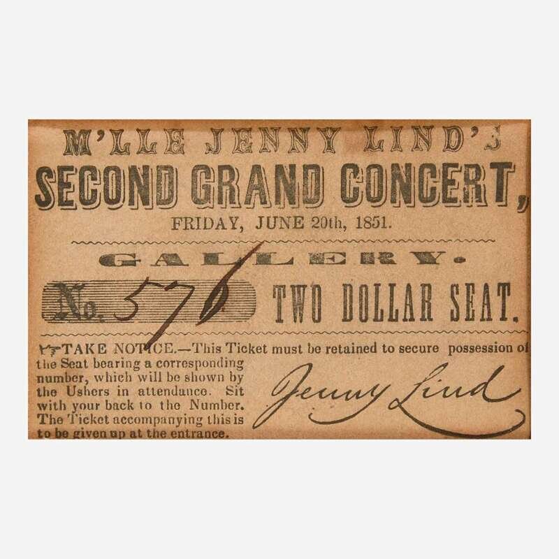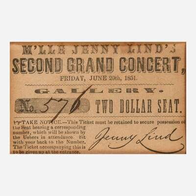 No place, Friday June 20, 1851. Cardstock ticket (no. #576) for a performance of Swedish opera singer Jenny Lind during her tour of America, with her facsimile signature. 2 x 3 1/4 in. (51 x 82 mm).