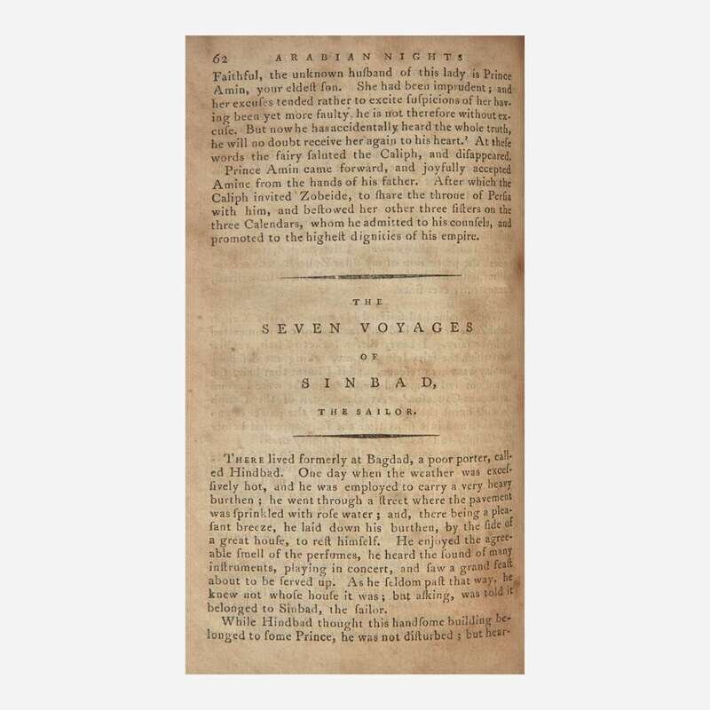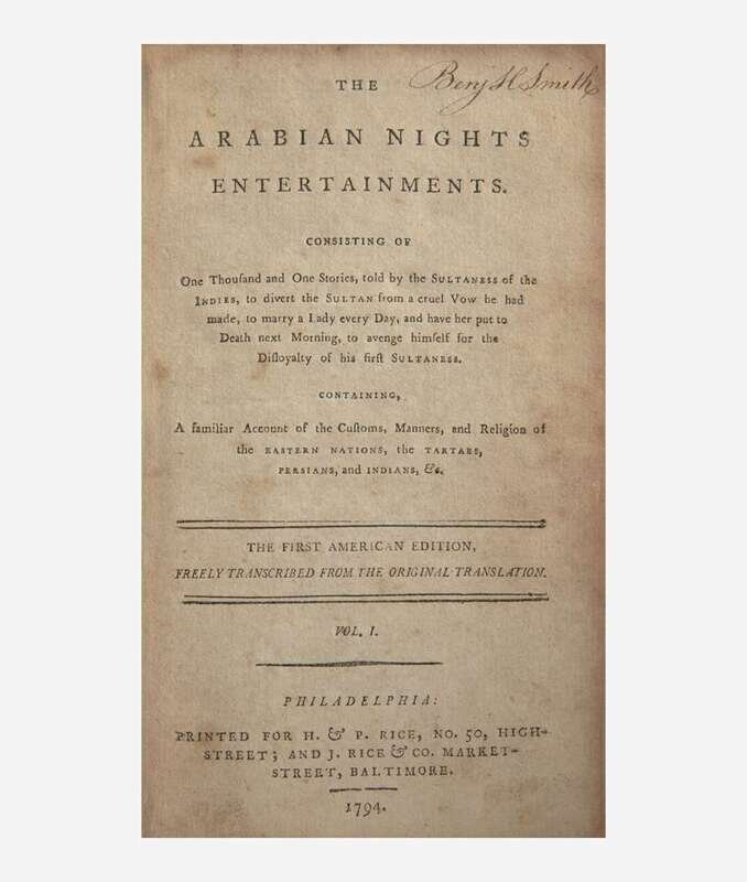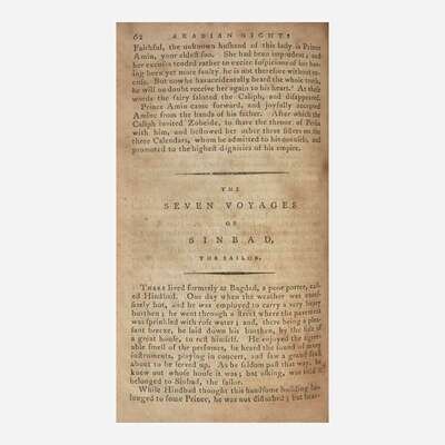 A very rare and complete first American edition of the Arabian Nights. Translated from Antoine Galland's French edition's of 1704-1717, and featuring 50 of the classic tales, including "Aladdin and the wonderful Lamp," "The seven Voyages of Sinbad," "Ali Baba and the forty Thieves," and many more.