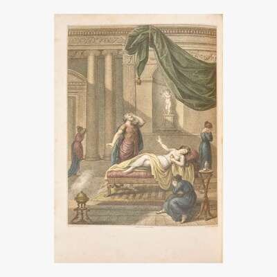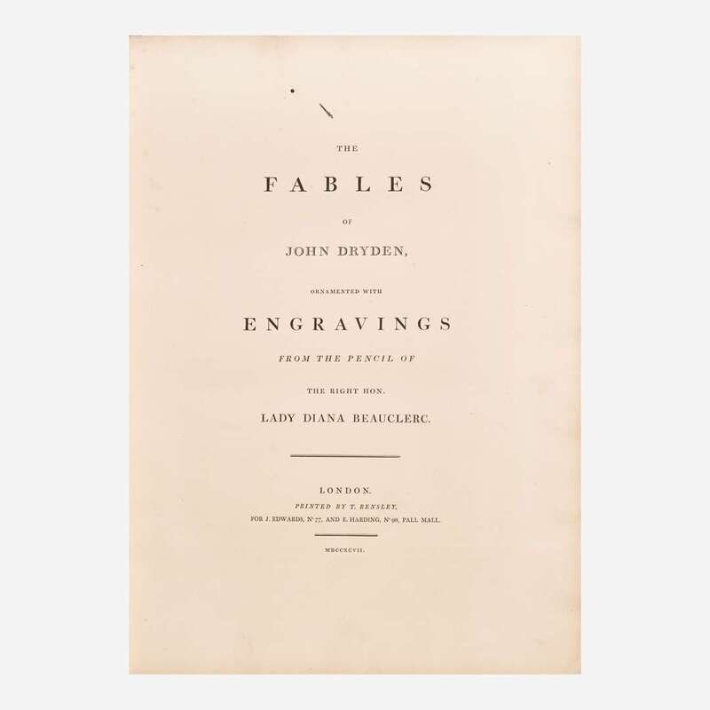 London: Printed by T. Bensley, for J. Edwards, and E. Harding, 1797. First edition thus. Folio. xviii, 241 pp. Illustrated with nine engraved plates and 15 engraved head- and tail-pieces, by Bartolozzi, Vanderburg, T. Cheesman, and others after Lady Diana Beauclerc; all with fine contemporary hand-coloring; with tissue guards. Contemporary full straight-grain crimson morocco, stamped in gilt, boards and extremities rubbed, minor scratches to front and rear boards, corners moderately worn, spine ends rubbed; all edges gilt; marbled endpapers; ownership signature in pen on front blank and at top of rear paste-down; two small ink stains at top of title-page; small open tear in fore-edge of p. (173); scattered minor foxing and offsetting. With the armorial book-plate of Herbert John Buckmaster on front paste-down.