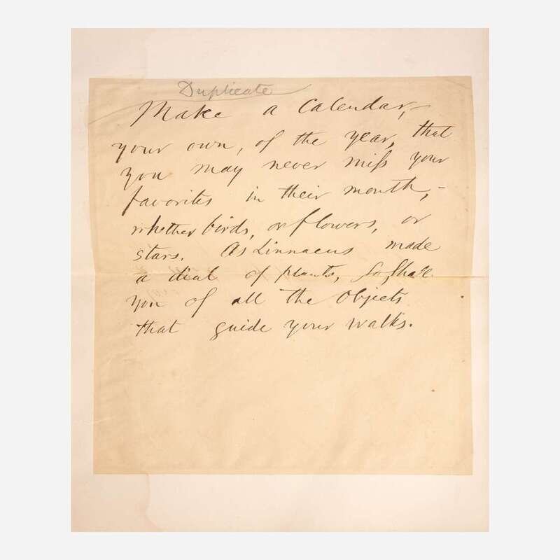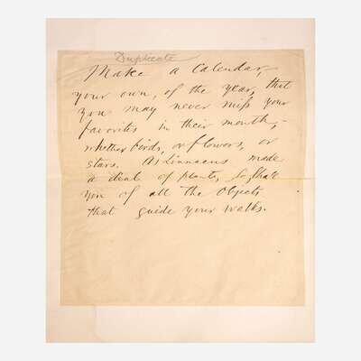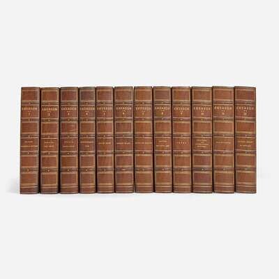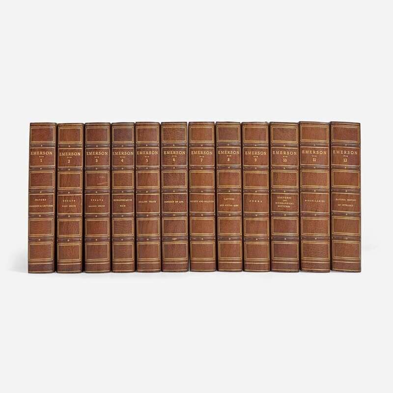 Cambridge: The Riverside Press, for Houghton Mifflin, 1903-04. In 12 volumes. Autograph Centenary Edition, #324/600 copies signed by the publisher, and with an autograph manuscript leaf by Emerson bound in first volume, containing lines from Concord Walks: "Make a calendar, your own, of the year, that you may never miss your favorites in their month, whether birds, or flowers, or stars. As Linnaeus made a dial of plants, so shall you of all the objects that guide your walks." (printed on p. 174 in Vol. XII, Natural History of Intellect...). Title-pages printed in red and in black. Illustrated with photogravure frontispiece in each volume, and numerous photogravures throughout set. Publisher's deluxe three-quarter brown niger over brown cloth-covered boards, stamped in gilt; top edges gilt, other edges untrimmed; some volumes partially unopened; autograph leaf separating along center fold. Myerson B19