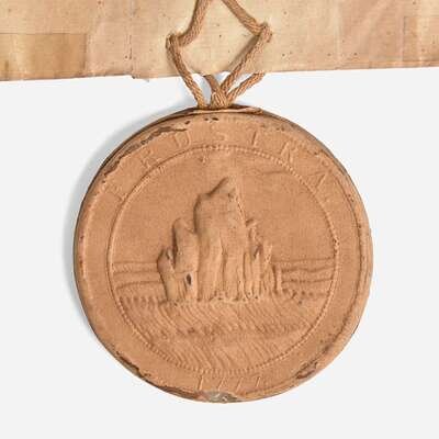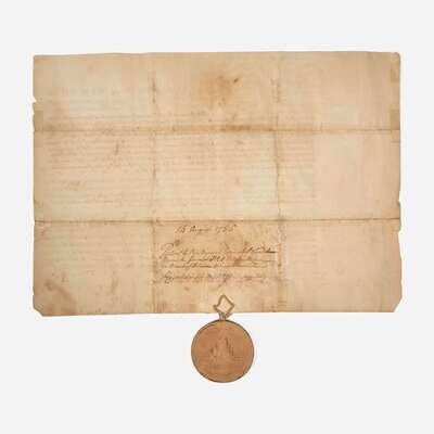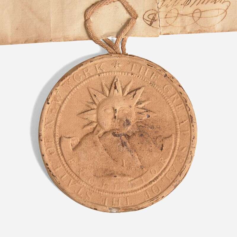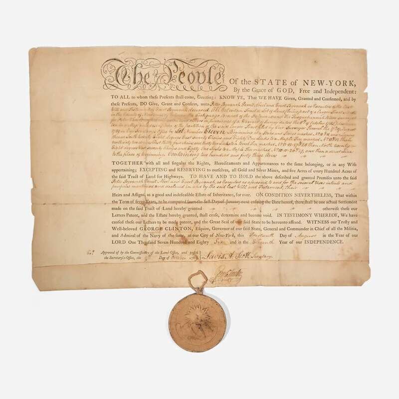 New-York, August 14, 1786. Partially-printed land grant, accomplished in a secretarial hand, and signed by George Clinton as Governor of New York, for Peter Byvanck, Garrit Abeel, and Evert Byvanck as executors for the estate of Evert Byvanck, for land in Montgomery County, being Lot 11, "between the Cookguago Branch of the Delaware and the Susquehannah Rivers"; counter-signed by Secretary of the Land Office, Lewis A. Scott; with original paper-covered wax pendant seal of New York at bottom; docketed on verso. Creasing from contemporary folds, repaired on verso with sello tape; vertical tear running through "G" in Clinton's signature; scattered short closed tears along folds and edges.