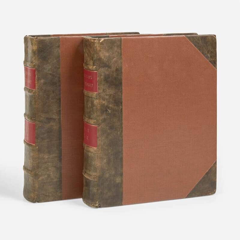 London: Printed for J.F. and C. Rivington, L. Davis, T. Payne and Son, et al., 1785. The Sixth Edition. 4to. Half-title wanting in second volume. Illustrated with an engraved frontispiece portrait of Johnson by T. Cook after Sir Joshua Reynolds. Period-style three-quarter mottled brown calf over brown buckram-covered boards, stamped in blind, red morocco spine labels, stamped in gilt; all edges trimmed; dampstaining in bottom of frontispiece; title-pages moderately creased and slightly worn; scattered wear in leaves at front and at rear. Courtney & Smith, p. 57