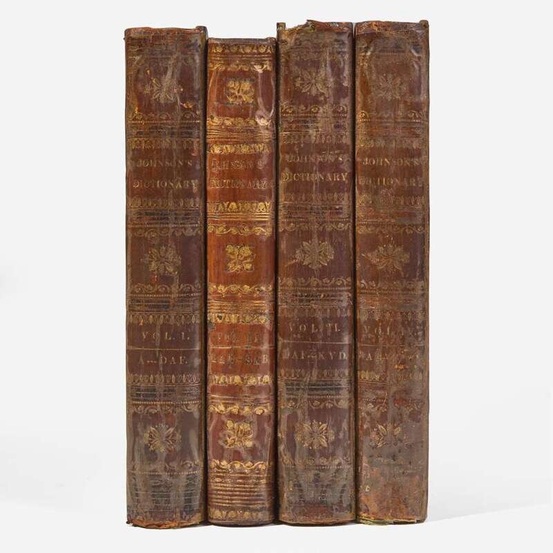 Philadelphia: Published by Moses Thomas, 1818. In four volumes. First American edition. 4to. Half-title in first volume; half-title wanting in third volume. Illustrated with an engraved frontispiece portrait of Johnson in first volume, by G. Fairman after Sir Joshua Reynolds. Contemporary three-quarter brown calf over marbled paper-covered boards, spine repaired with tape, extremities and boards rubbed and variously worn; red speckled edges; scattered foxing and light toning to text; gutter worn at "Damask" in second volume, light dampstaining in top edge of some leaves at front of same; rear free endpaper in third volume torn away; gutter worn at front of fourth volume. Courtney & Smith p. 58