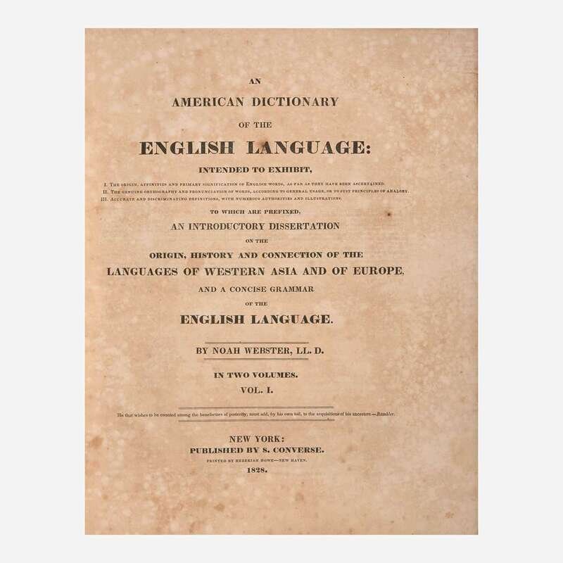 First edition of Noah Webster's highly important American dictionary of the English language, considered "the most ambitious publication ever undertaken, up to that time, upon American soil." (Dictionary of American Biography). Guided by a nationalistic desire to codify a distinctly American language, Webster began publishing spelling books, grammars, and readers, for children, in the 1780s. His work in lexicography began in 1800, and this unabridged dictionary was preceded by a much shorter duodecimo version in 1806, Compendious Dictionary of the English Language. With the publication of this set, "Webster set a new standard for etymological investigation, and for accuracy of definition, and included 70,000 words, as against the 58,000 of any previous dictionary." (Grolier).