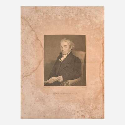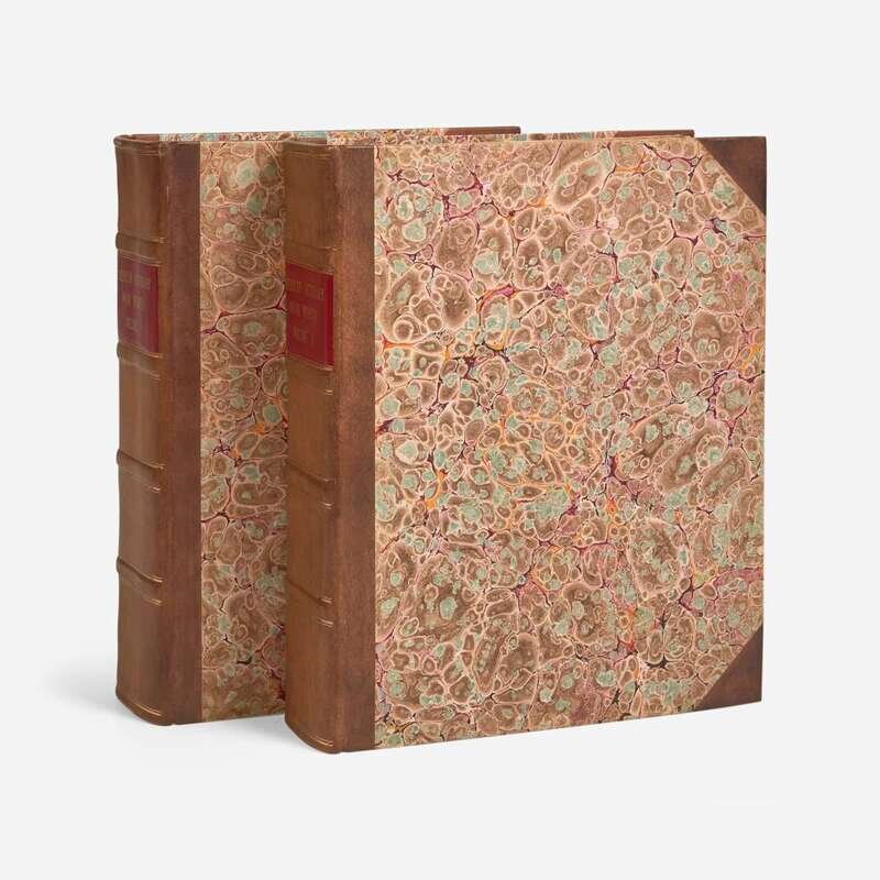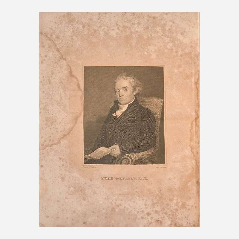 New York: Published by S. Converse. Printed by Hezekiah Howe--New Haven, 1828. In two volumes. First edition (one of only 2,500 copies printed). Thick 4to. Unpaginated. Printed in three columns. With "Additions--Corrections" leaf at end of second volume; without ad leaf sometimes found tipped or bound into first volume. Illustrated with engraved frontispiece portrait of Webster by A.B. Durand after S.F.H. Morse, in first volume. Three-quarter brown calf over marbled paper-covered boards, red morocco spine labels, stamped in gilt; top edges trimmed, other edges untrimmed; foxing and dampstaining to frontispiece; foxing to each title-page; moderate to heavy foxing throughout each volume. Skeel 583; Sabin 102335; Grolier, 100 American, 36; PMM 291