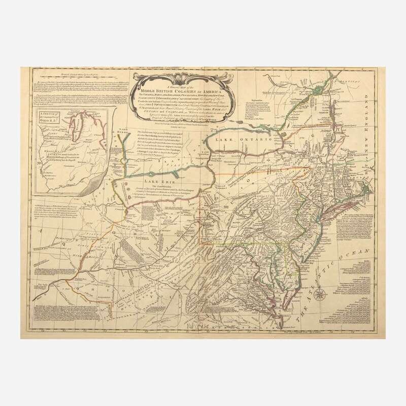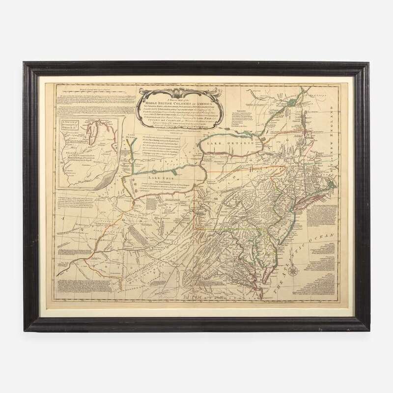 London: Carington Bowles, 1771. Third state (of four). Engraved map with hand-colored outlining, 20 7/8 x 28 in. (530 x 711 mm). Toned along edges, scattered soiling and old tape residue on recto of same; tape repair in center left edge verso; contemporary manuscript on verso, "American / Middle British Colonies". In mat and in frame, 23 5/8 x 30 1/4 in. (600 x 768 mm). Stevens & Tree 29c