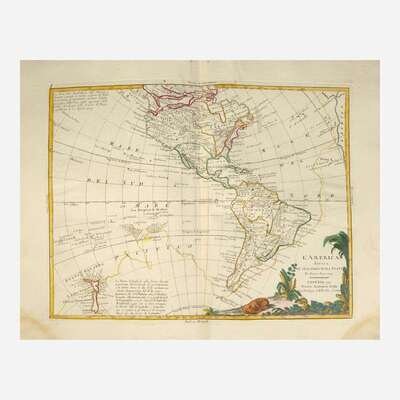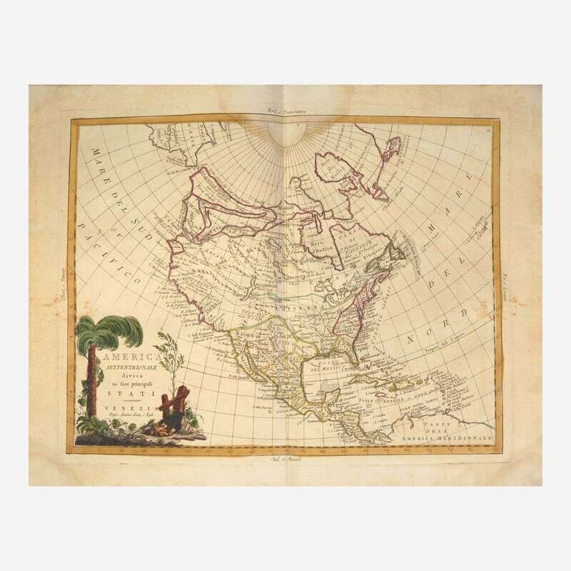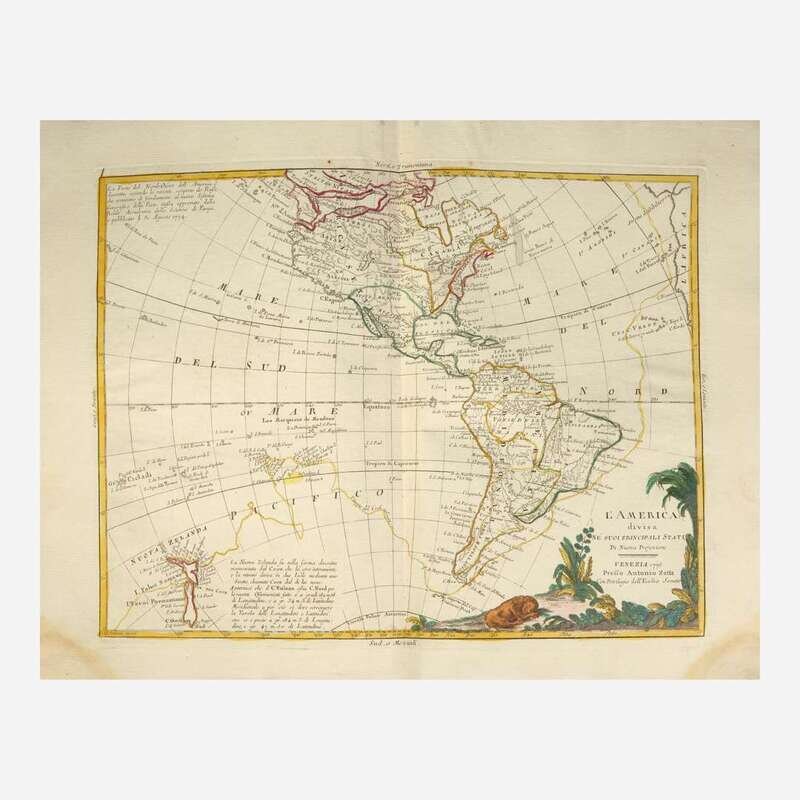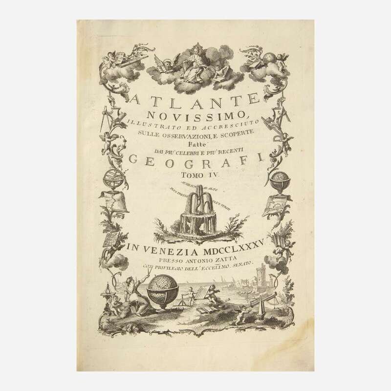 Venice: Antonio Zatta, 1785. First edition. Volume IV only. Folio. Illustrated with an engraved title-page and 45 (of 65) double-page engraved maps, each with hand-colored outlining; lacking the 20-map North American section (including the John Mitchell maps). Full contemporary vellum-covered boards, stamped in gilt; corners worn and water damaged, top and bottom of front joint splitting, headcap worn; all edges stained red; paste paper paste-downs; dampstaining in bottom corner and upper gutter of all leaves; ownership signature on front blank, book-plate on same. Sold with all faults.
