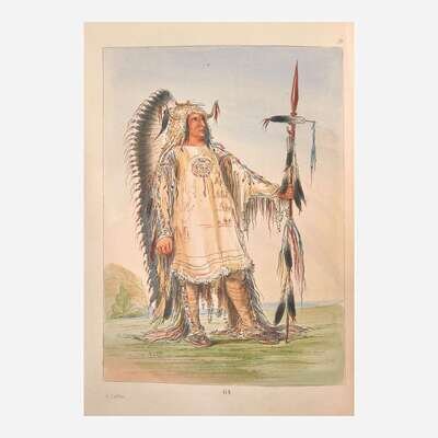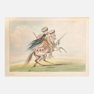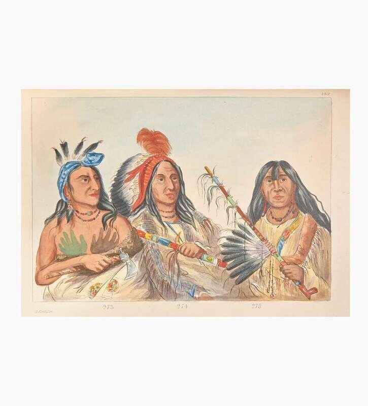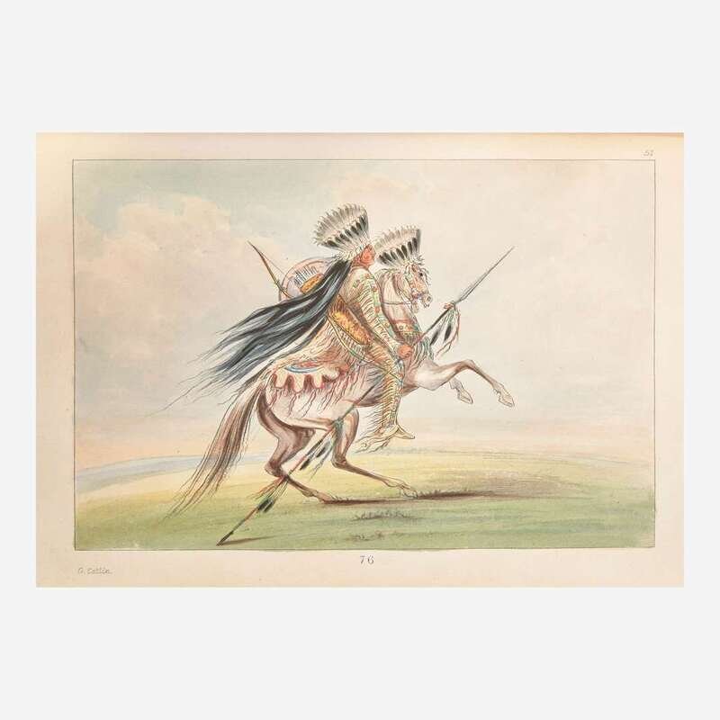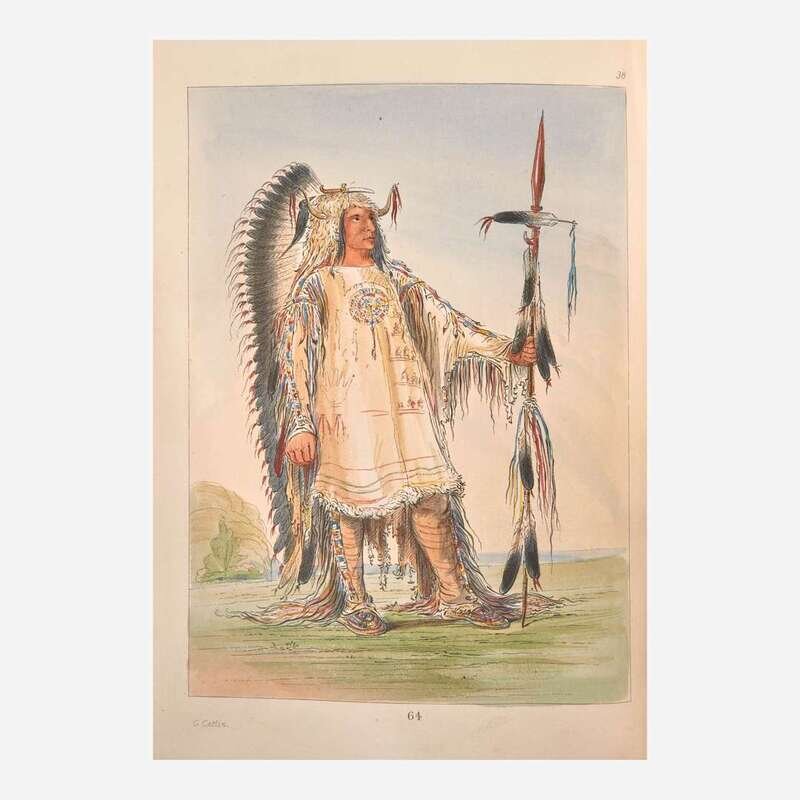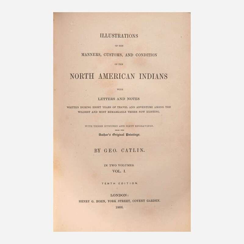 A scarce and handsome set of this specially produced hand-colored issue of Catlin's celebrated work. First published by Catlin in 1841 with the title Letters and Notes on the Manners, Customs, and Condition of the North American Indians, his work immediately went through many editions in many languages. By 1845 the rights were purchased by London publisher Henry G. Bohn, and he began issuing new editions with the altered title as above. Beginning with the fifth edition and continuing to the tenth, Bohn offered special hand-colored sets at ten guineas each, alongside the uncolored regular copies. Sabin notes that "Mr. Bohn had twelve or more copies colored after the fancy of the artist who did the work," while Howes indicates that only "a few copies of the L(ater) ed(ition)s...had pl(ate)s hand-col(ored)." Field further notes regarding the scarcity of this issue, writing that a "number of copies (often announced to have been but twelve) have the etchings colored. The first which were offered to the public were sold at a high price on account of the supposed rarity, but it is said that a large number of copies with colored etchings were found by Mr. Bohn in an out-house, and they have consequently become somewhat more common."