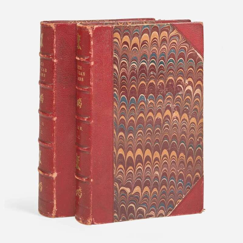 London: Henry G. Bohn, 1866. In two volumes. Deluxe issue of the tenth edition. 8vo. viii, 264; viii, 265, (1) pp. Illustrated with hand-colored engraved frontispiece in Vol. I and 180 numbered and magnificently hand-colored engraved plates throughout the set, including three maps (one folding), all by Catlin. Publisher's three-quarter red morocco over marbled paper-covered boards, stamped in blind and in gilt, boards, joints, and extremities rubbed; all edges gilt; matching marbled endpapers; front hinges of Vol. I and II worn, rear hinge of Vol. II lightly worn; light to moderate foxing to text and plates. Howes C-241; Sabin 11537; Field 260; Wagner-Camp 84
