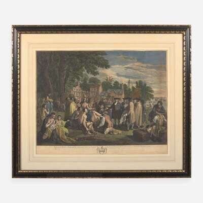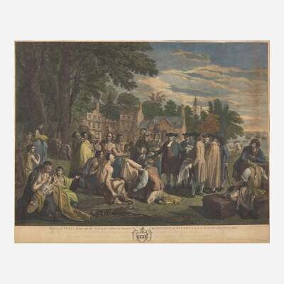 A scarce engraving of an iconic image, depicting William Penn entering into the Treaty of Shackamaxon with the Lenni Lenape people, considered one "of the best-known prints of a Philadelphia scene" (Snyder, City of Independence, p. 252). To help bolster the reputation of the Penn family, William Penn's son Thomas (1702-75) commissioned Benjamin West to create his allegorical painting, which John Boydell based his print on.