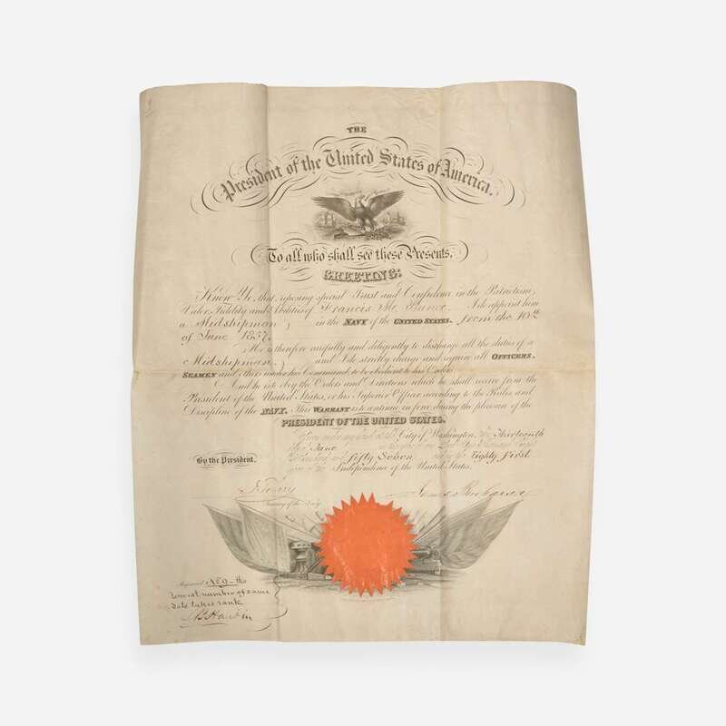 Washington, (D.C.), June 13, 1857. Partially-printed military commission on vellum, signed by James Buchanan as President of the United States, appointing Francis M. Bunce a "Midshipman in the Navy of the United States, from the 10th of June 1857"; counter-signed by Secretary of the Navy Isaac Toucey; manuscript in bottom left registering the document. Orange paper seal at bottom; creasing from contemporary folds; two small holes in center left fold; creasing in top right. 16 x 13 3/4 in. (406 x 349 mm).