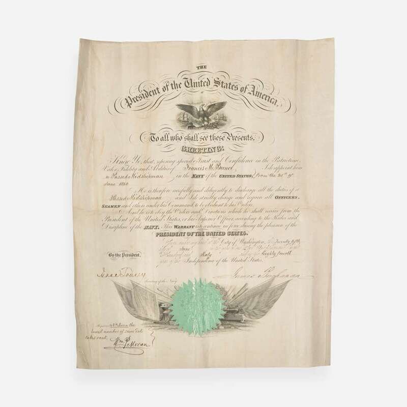 Washington, (D.C.), June 25, 1860. Partially-printed military commission on vellum, signed by James Buchanan as President of the United States, appointing Francis M. Bunce a "Passed Midshipman in the Navy of the United States, from the 25th of June 1860"; counter-signed by Secretary of the Navy Isaac Toucey; manuscript in bottom left registering the document. Green paper seal at bottom; creasing from contemporary folds; creasing along right edges, light soiling to same. 16 7/8 x 13 5/8 in. (429 x 346 mm).