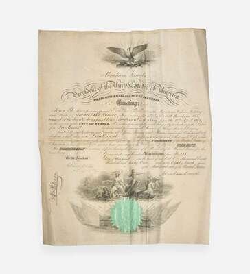 Washington, (D.C.), August 5, 1861. Partially-printed military commission on vellum, signed by Abraham Lincoln as President of the United States, appointing Francis M. Bunce a "Lieutenant in the Navy, from the 11th April 1861, in the service of the United States."; counter-signed by Secretary of the Navy Gideon Welles; manuscript in bottom left registering the document. Green paper seal at bottom; creasing from contemporary folds; scattered spotting along edges.