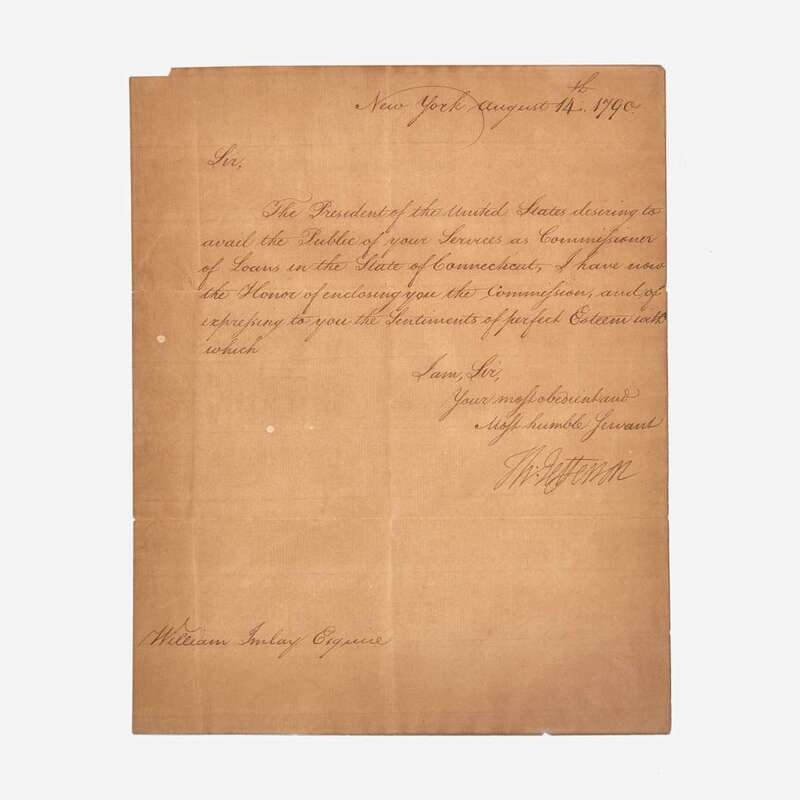 New York, August 14, 1790. One sheet folded to make four pages, 9 5/8 x 7 3/4 in. (244 x 197 mm). One-page manuscript document, signed by Thomas Jefferson as Secretary of State, to William Imlay, sending him his commission to be Commissioner of Loans in the State of Connecticut: "Sir, The President of the United States desiring to avail the Public of your Services as Commissioner of Loans in the State of Connecticut, I have now the Honor of enclosing you the Commission, and of expressing to you the Sentiments of perfect Esteem with which I am, Sir, Your most obedient and Most humble Servant Th: Jefferson." Creasing from contemporary folds, separations along center vertical fold, and along some horizontal folds; toned; small chip in bottom edge; small loss in top corners of integral leaf from previous mounting, tape residue on same leaf from additional mounting.