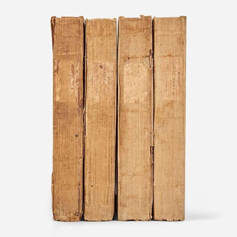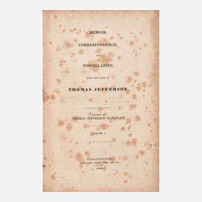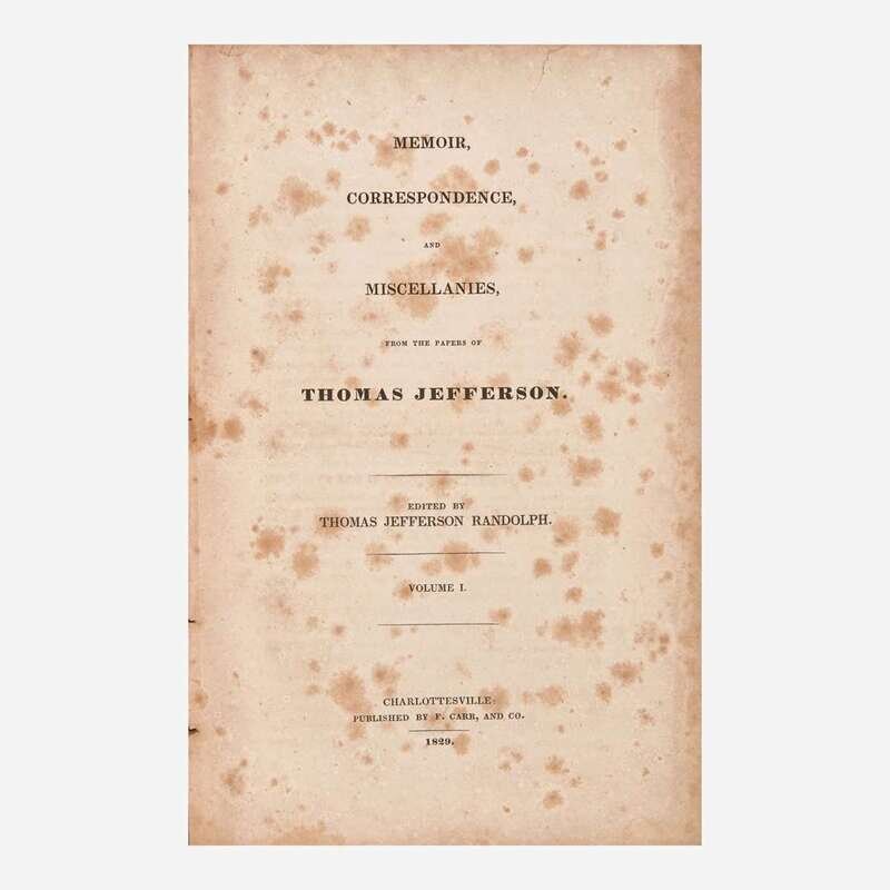 Charlottesville, (Virginia): Published by F. Carr, and Co., 1829. In four volumes. First edition. viii, (ii), 466; (iv), 500; (iv), 519; (iv), 532 pp. Edited by Thomas Jefferson Randolph. With half-titles in each volume, and four folding facsimile leaves in rear of Vol. IV reproducing Jefferson's handwritten draft of the Declaration of Independence. Illustrated with an engraved frontispiece portrait of Jefferson after Gilbert Stuart in Vol. IV. Original quarter cloth over blue paper-covered boards, remnants of original paper spine labels; boards worn and soiled; splits and tears in spines; rear board of Vol. II detached but holding; front board of Vol. IV starting; Vols. III and IV partially unopened; moderate to heavy foxing throughout set; large closed tear in top corner, p. 1/2 in Vol. II; several leaves in Vols. III and IV darkened; front free endpaper starting in Vol. IV. Howes R-60; Sabin 35891; Shoemaker 39133