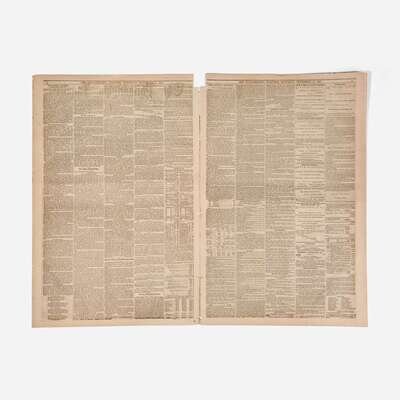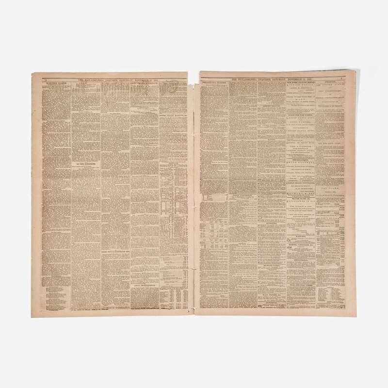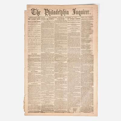 Philadelphia: (William W. Harding), Saturday, November 21, 1863. Two bifolium sheets folded into eight pages, 19 1/4 x 25 1/2 in. (489 x 642 mm). Printed newspaper in five columns, featuring extensive coverage of the dedication of the Gettysburg National Cemetery on November 19, 1863, where President Abraham Lincoln delivered his Gettysburg Address. While the text of the speech is lacking, the issue features a summary of the three-day battle, an overview of the events leading to the cemetery's establishment, an enumeration of the dead, details of the ceremonial procession, and more. Creasing from old folds; disbound; first page starting but still attached.